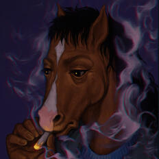 Clothes: blue x-patterned sweater partially covered by a grey jacket. grey pants and sneakers.